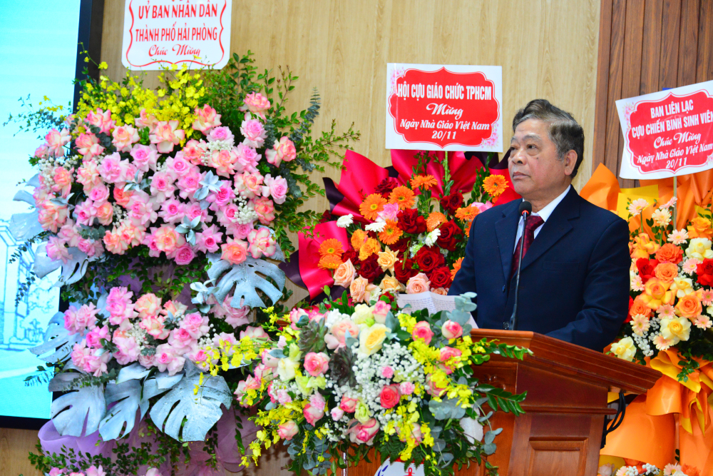 Nhà giáo Phạm Ngọc Tuyền - Chủ tịch Hội Cựu giáo chức Trường Đại học Hàng hải Việt Nam phát biểu cảm ơn Nhà trường