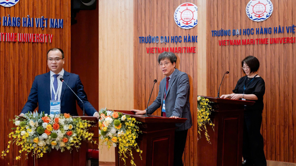 PGS.TS. Nguyễn Minh Đức - Phó Hiệu trưởng Trường Đại học Hàng hải Việt Nam, GS. Hyeon Kyu Yoon - Trường Đại học Quốc gia Changwon và GS. Akiko Uchino - Trường Đại học Khoa học và Công nghệ Hàng hải Tokyo phát biểu tại Phiên Khai mạc Hội thảo ACMSSR 2025