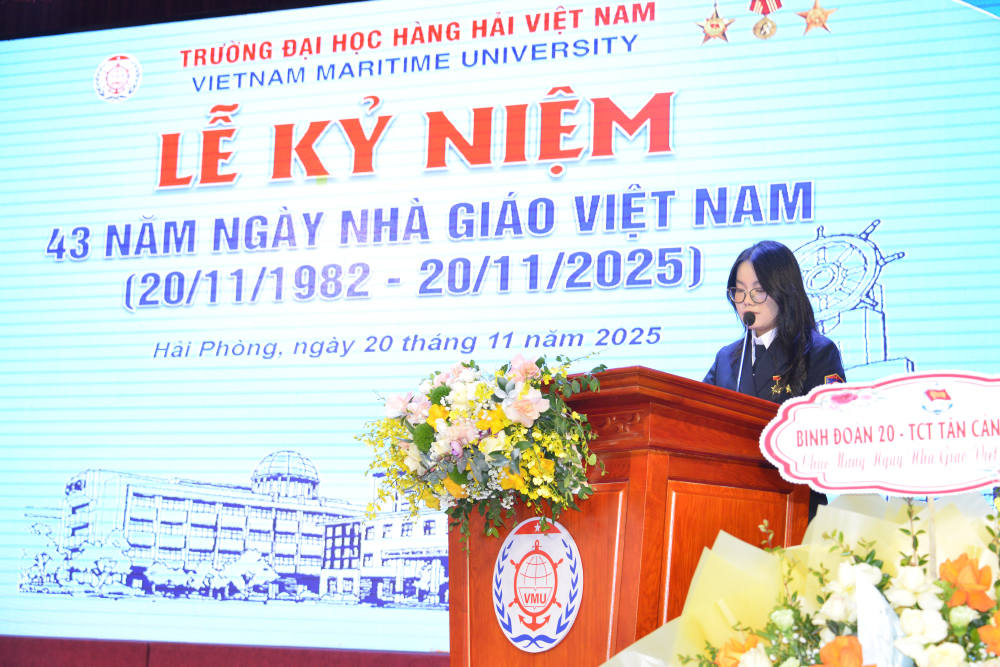 Sáng 20/11/2025, Trường Đại học Hàng hải Việt Nam đã tổ chức: “Lễ Kỷ niệm 43 năm ngày Nhà giáo Việt Nam” (20/11/1982 - 20/11/2025). Tới dự và chung vui với thầy và trò Trường Đại học Hàng hải Việt Nam có đồng chí Nguyễn Minh Hùng - Phó Chủ tịch UBND thành phố Hải Phòng; đồng chí Đỗ Thị Phong Lan - Phó Vụ trưởng Vụ Tổ chức cán bộ, Bộ Xây dựng; các Thầy, Cô nguyên là lãnh đạo Trường, nguyên cán bộ chủ chốt Nhà trường qua các thời kỳ, Ban Chấp hành Hội Cựu giáo chức và đại diện Câu lạc bộ truyền thống Trường Đại học Hàng hải Việt Nam tại thành phố Hồ Chí Minh, các Nhà giáo nhân dân, Nhà giáo ưu tú, cùng các thầy, cô giáo đại diện cho hơn 900 cán bộ, giảng viên của Nhà trường