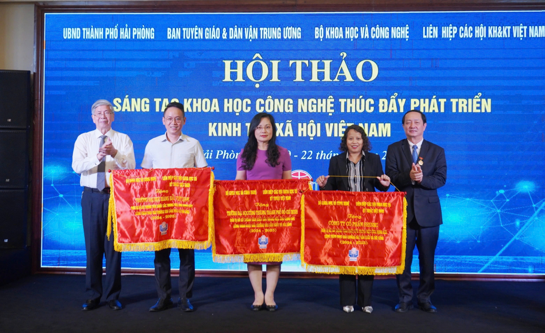 Ngày 21/8/2025, tại Hải Phòng, Liên hiệp các Hội Khoa học và Kỹ thuật Việt Nam phối hợp với Ban Tuyên giáo và Dân vận Trung ương, Bộ Khoa học và Công nghệ cùng UBND TP. Hải Phòng tổ chức Hội nghị khoa học với chủ đề “Đột phá phát triển khoa học, công nghệ, đổi mới sáng tạo và chuyển đổi số thúc đẩy phát triển kinh tế - xã hội Việt Nam”. Đại diện Trường Đại học Hàng hải Việt Nam tham dự Hội nghị có PGS.TS. Nguyễn Minh Đức, Phó Hiệu trưởng Nhà trường và TS. Trần Thế Nam, Trưởng phòng Khoa học - Công nghệ.
